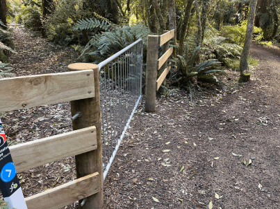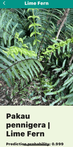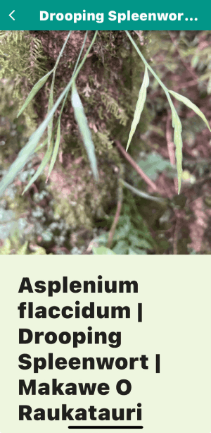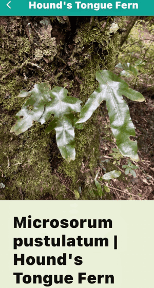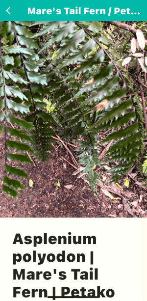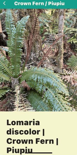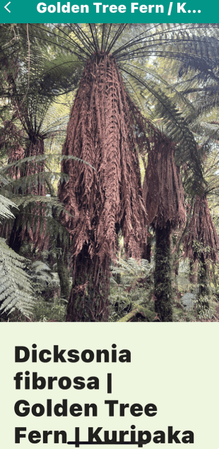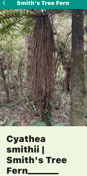 Now walk up the track, pointing and calling out, "Crown Fern, piupiu; Dixonia, the golden one: umm...whaaat!??? and haul out your cell phone. There are three more tree ferns for you to find; — the silver fern with white leaf undersides — the black monkey tail tree fern. — you probably didn't find the young wheki near the gate. |